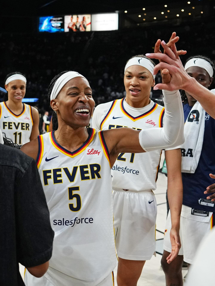 wnba官方账号发布推文称,胜利的喜悦半决赛首战告捷后,@indianafever全队笑容满面!#WelcometotheW|WNBA季后赛|@google