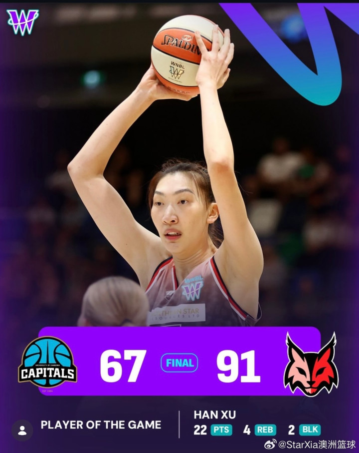 中国女篮名将韩旭11月29日在澳大利亚女篮联赛(WNBL)的首秀中得到22分,帮助珀斯山猫队客场以91:67轻取堪培拉大学首都队。