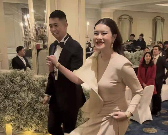 在教堂完成结婚仪式之后,一对新人又转战酒店,举办晚宴。由于举办的桌数不多,雷正殷也是脱下了厚重的婚纱,换了一套简单的驼色礼裙,依旧很有设计感。